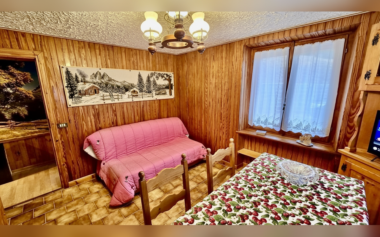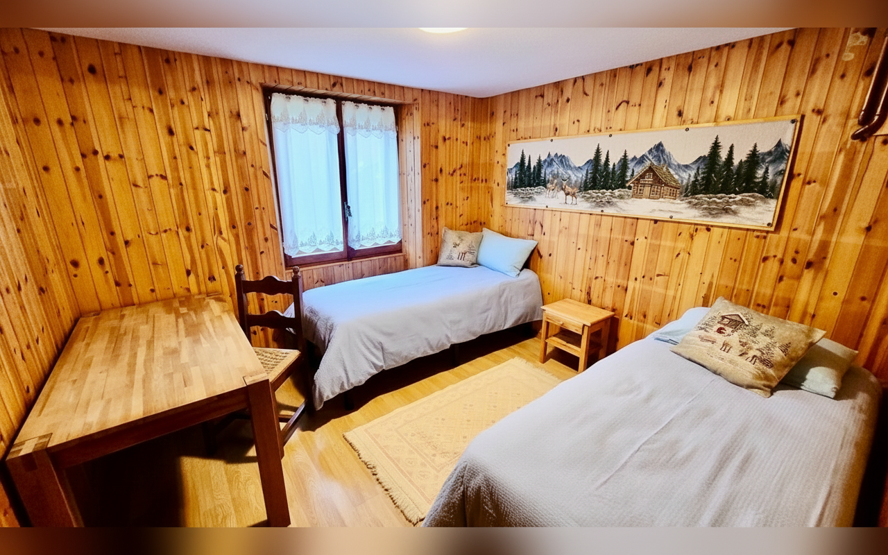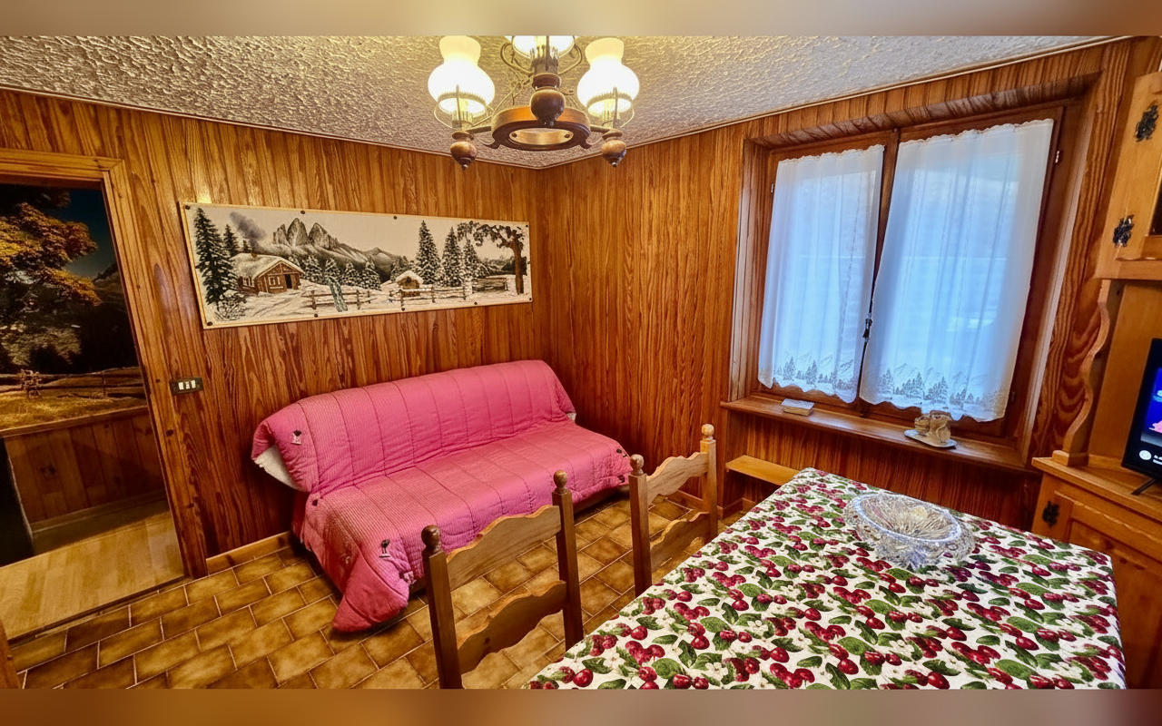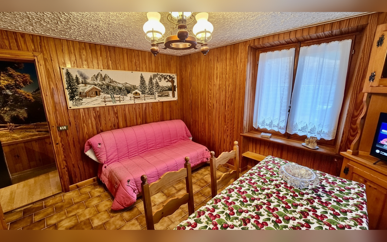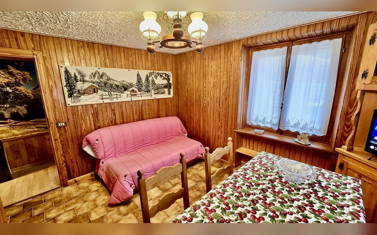 Elegante appartamento di 120 mq con tre camere matrimoniali, soggiorno con divano letto, cucina completa e bagno. Perfetto per gruppi fino a 7 persone, offre spazi ampi e luminosi con una terrazza privata per godere della vista sulle montagne.