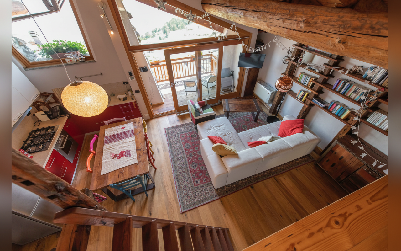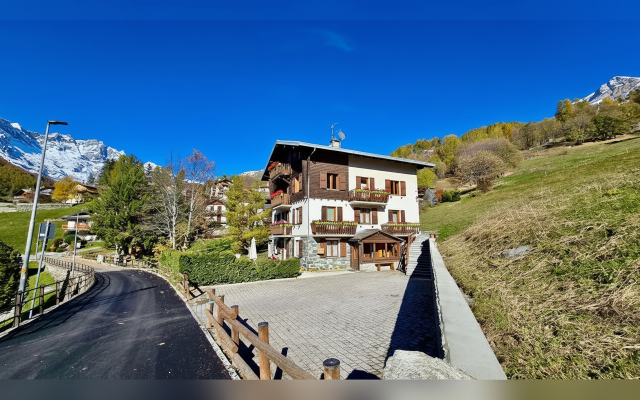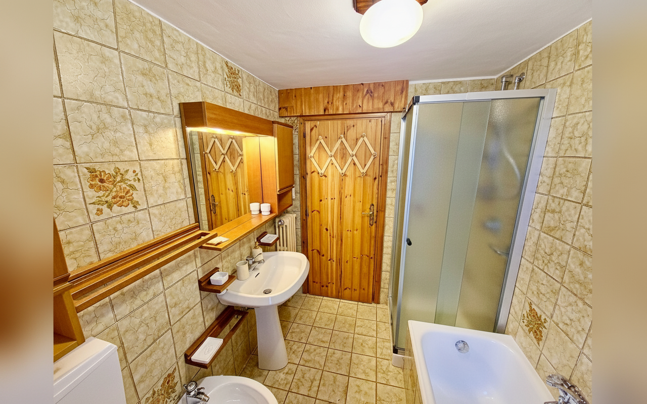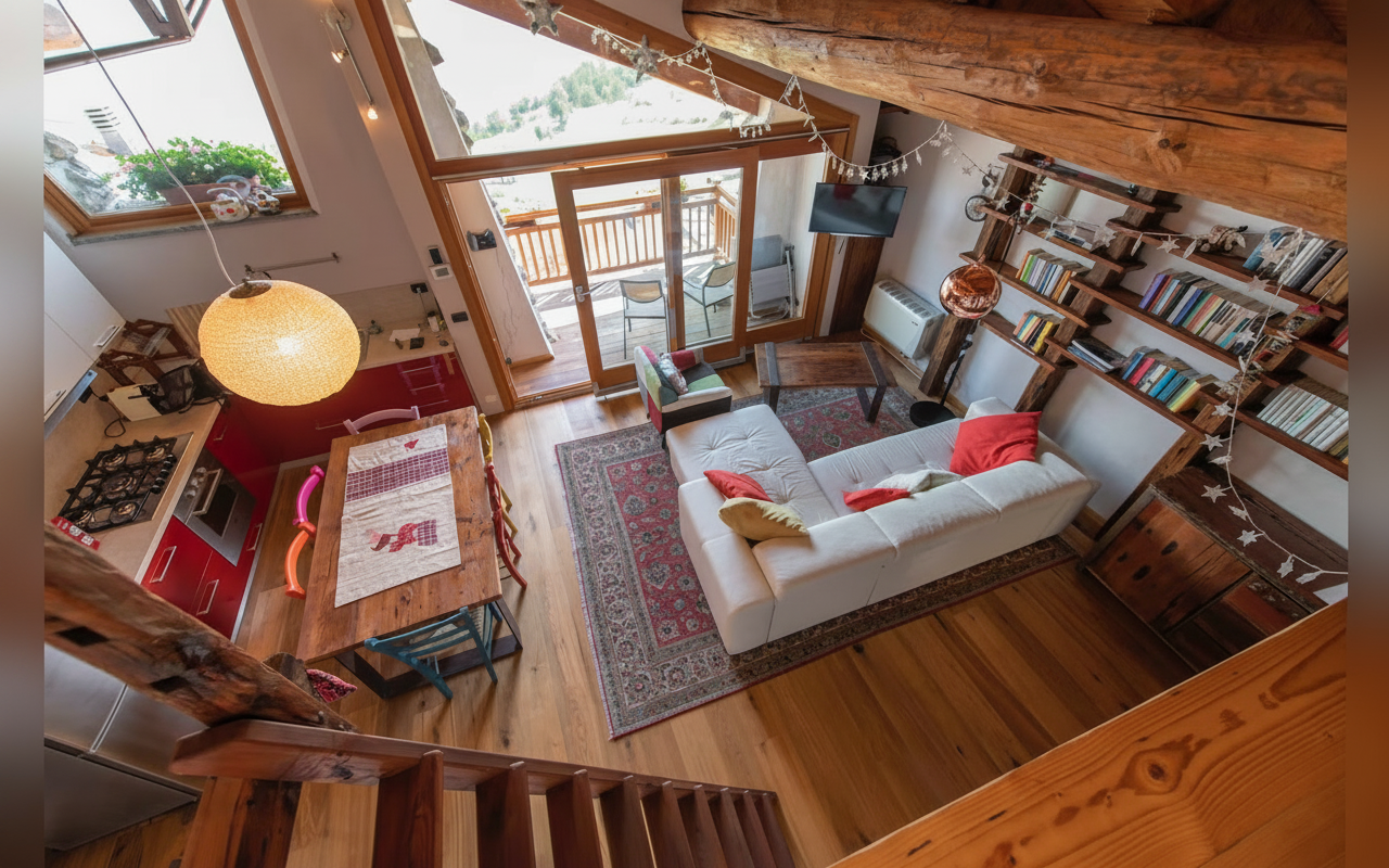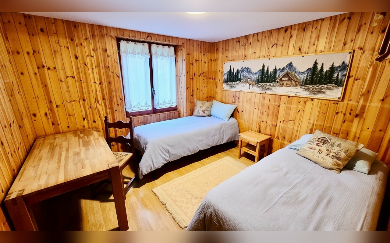 Elegante appartamento di 120 mq con tre camere matrimoniali, soggiorno con divano letto, cucina completa e bagno. Perfetto per gruppi fino a 7 persone, offre spazi ampi e luminosi con una terrazza privata per godere della vista sulle montagne.